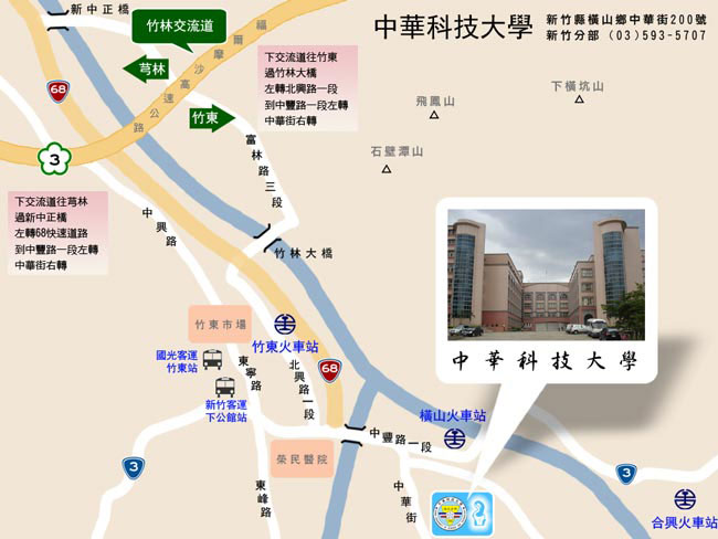 北二高竹林交流道(路標90公里)--> 往芎林方向(120縣道)--> 直走第二個紅綠燈左轉--> 中正大橋--> 台68東西向快速路--> 往中豐路(橫山)直走到底--> 左轉上竹東大橋直走--> 第二個紅綠燈右轉〈依指示牌〉即可到達。