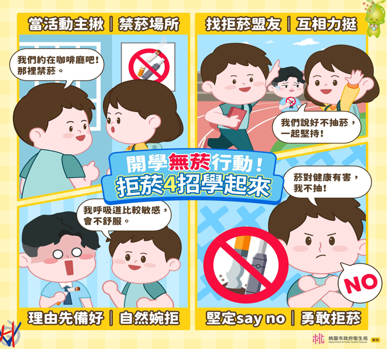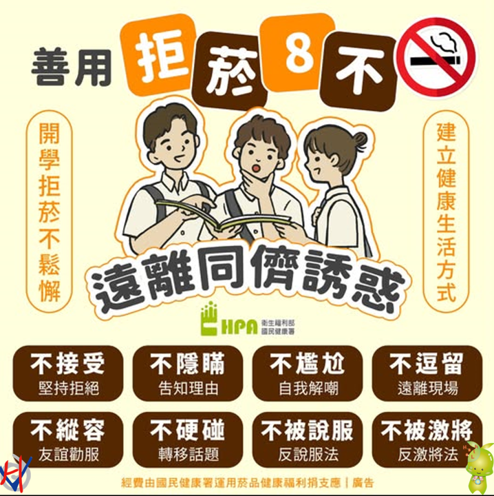 新學期就是新開始,是建立好習慣的起點,健康才是最重要的選擇。在青春最精彩的階段,朋友與同儕是生活中不可或缺的一部分,但也因此更容易受到影響。研究顯示,如果朋友吸菸,青少年開始吸菸的機率會比沒有吸菸朋友的同儕高出 17.5 倍。朋友很重要,但也要記得,真正的好朋友,不會用菸品來考驗你。在這樣的同儕壓力下,勇敢拒絕菸品,才是最成熟、自信的選擇,成為守護自己健康的重要關鍵。《菸害防制法》已將大專院校全面納入禁菸範圍,老師、同學與家人都會是你的支持力量。每一次的拒絕,都是對自己健康的肯定,也是為未來打下更好的基礎,期望營造一個安心、支持、健康的學習環境。