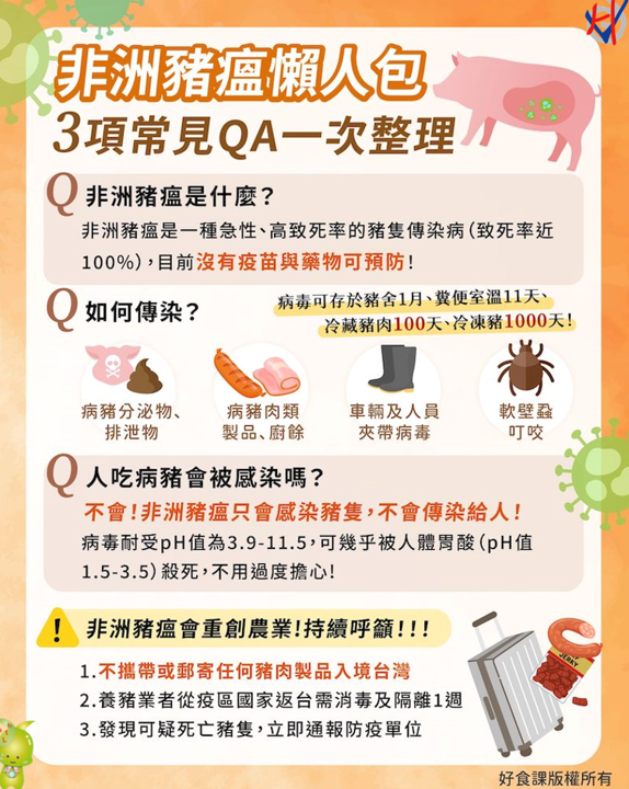►非洲豬瘟病毒能夠存在於冷藏豬肉100天、冷凍豬肉1000天、豬舍一個月、糞便室溫11天,時間不短;若收到可疑肉品,千萬不要任意丟到廚餘桶,正確的做法是「交給清潔隊妥善焚化處理」,才不會讓病毒進入廚餘鏈,增加疫病傳播風險。