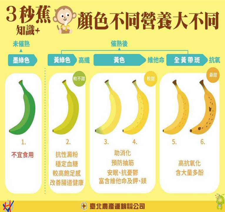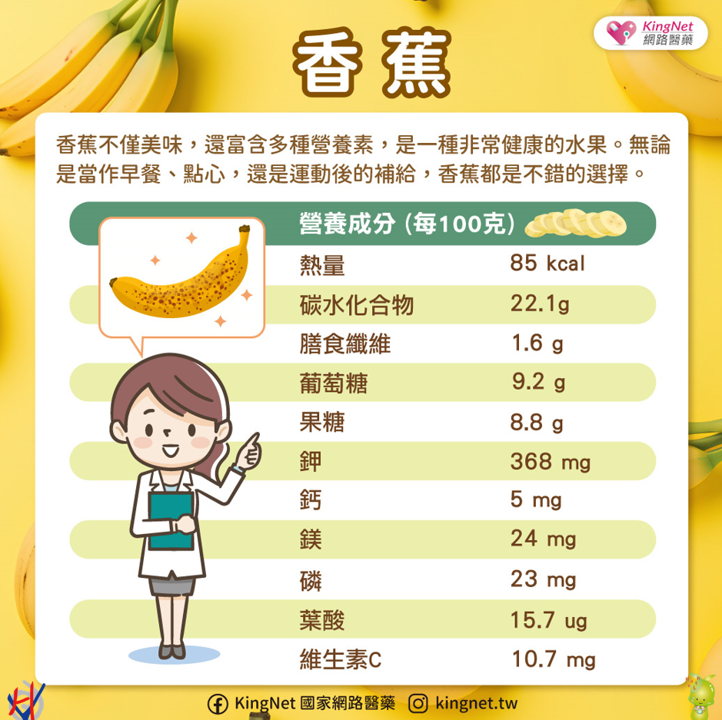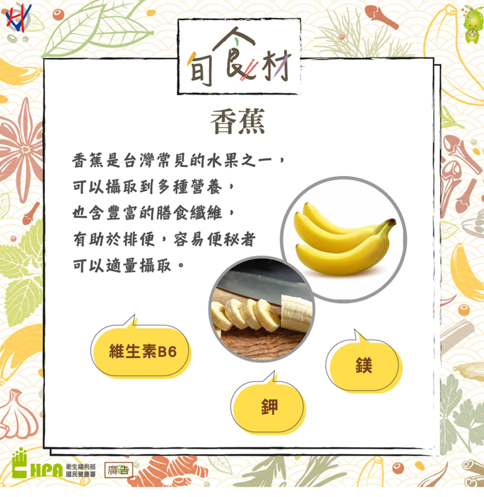 香蕉是臺灣常見的水果之一,可以攝取到多種營養素,除了豐富的膳食纖維,也包含維生素B6、鉀、鎂等。香蕉的鎂可以協助鈣和鉀的吸收,鉀是維持我們的神經反應協助碳水化合物的代謝以及穩定血糖。
