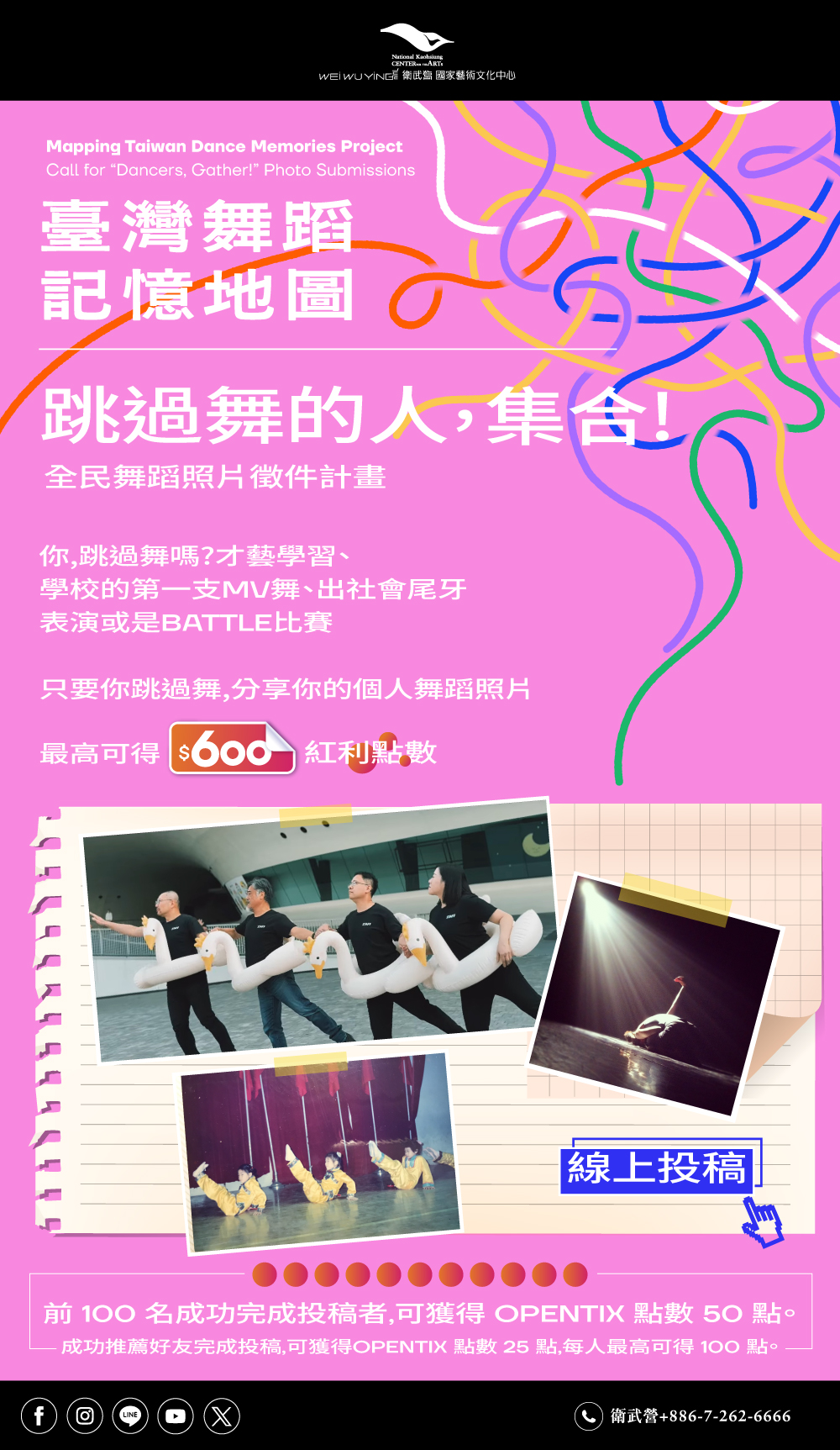 (二)「跳過舞的人,集合!」全民舞蹈照片徵件活動如附件簡章或參考衛武營官網網址:https://npacwwy.tw/en08gMrIj。