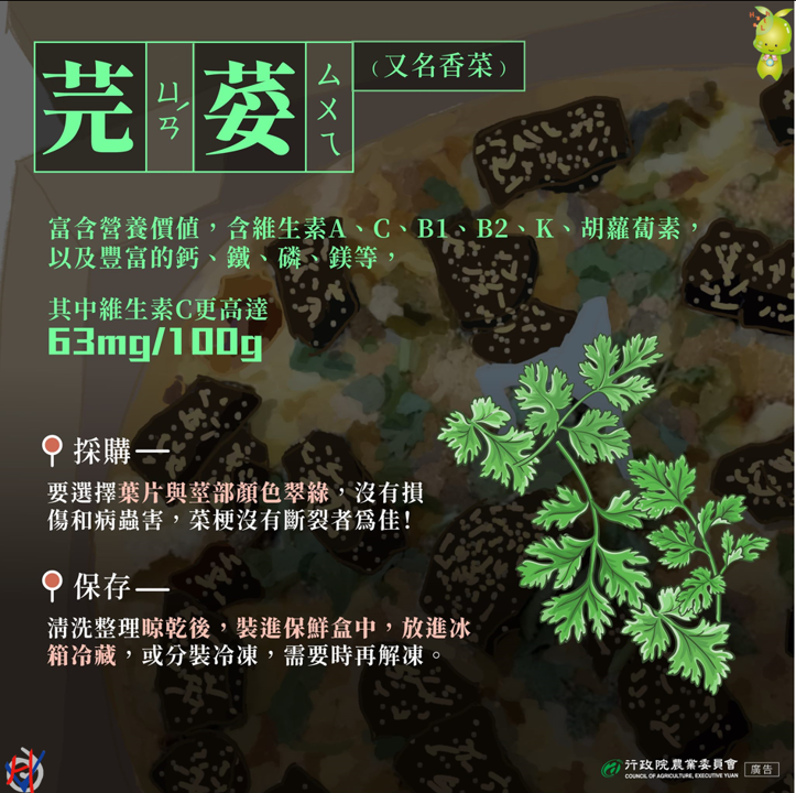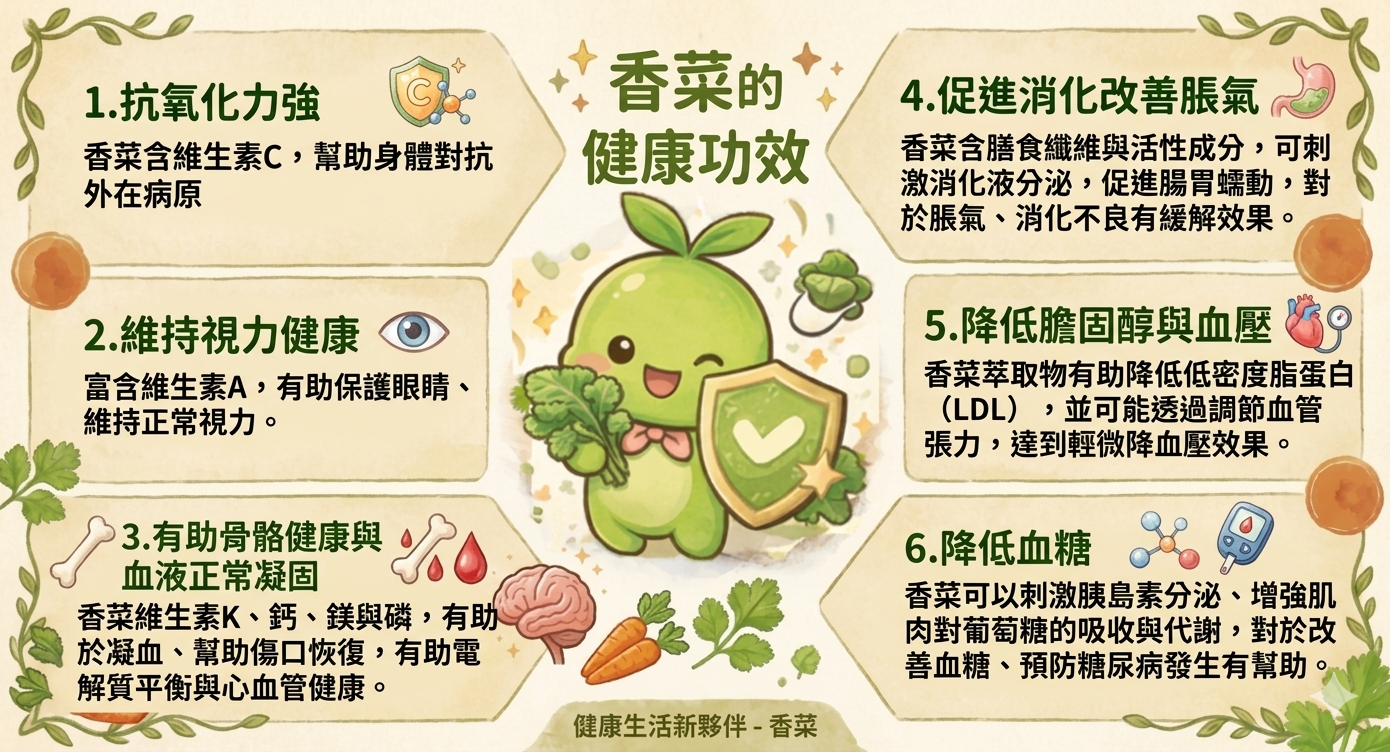 1.抗氧化力強:香菜含維生素C,幫助身體對抗外在病原