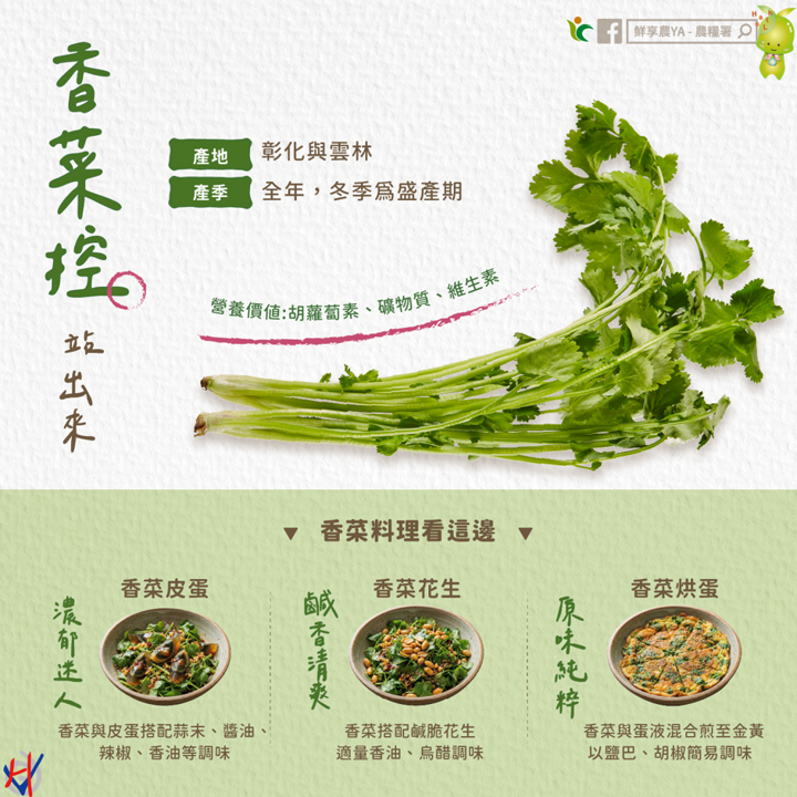 香菜的盛產地:彰化縣北斗鎮,有「香菜故鄉」之稱,產季為9月至隔年4月。特色活動:產地時常舉辦香菜相關創意市集,推廣在地香菜文化。