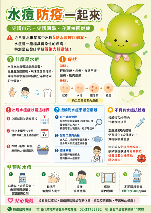 你知道嗎?水痘在還沒長出疹子前就可能傳染他人。近期臺北市某校園已出現5例確診個案,面對高傳染性的疾病,我們更需要了解疾病並做好防護措施。