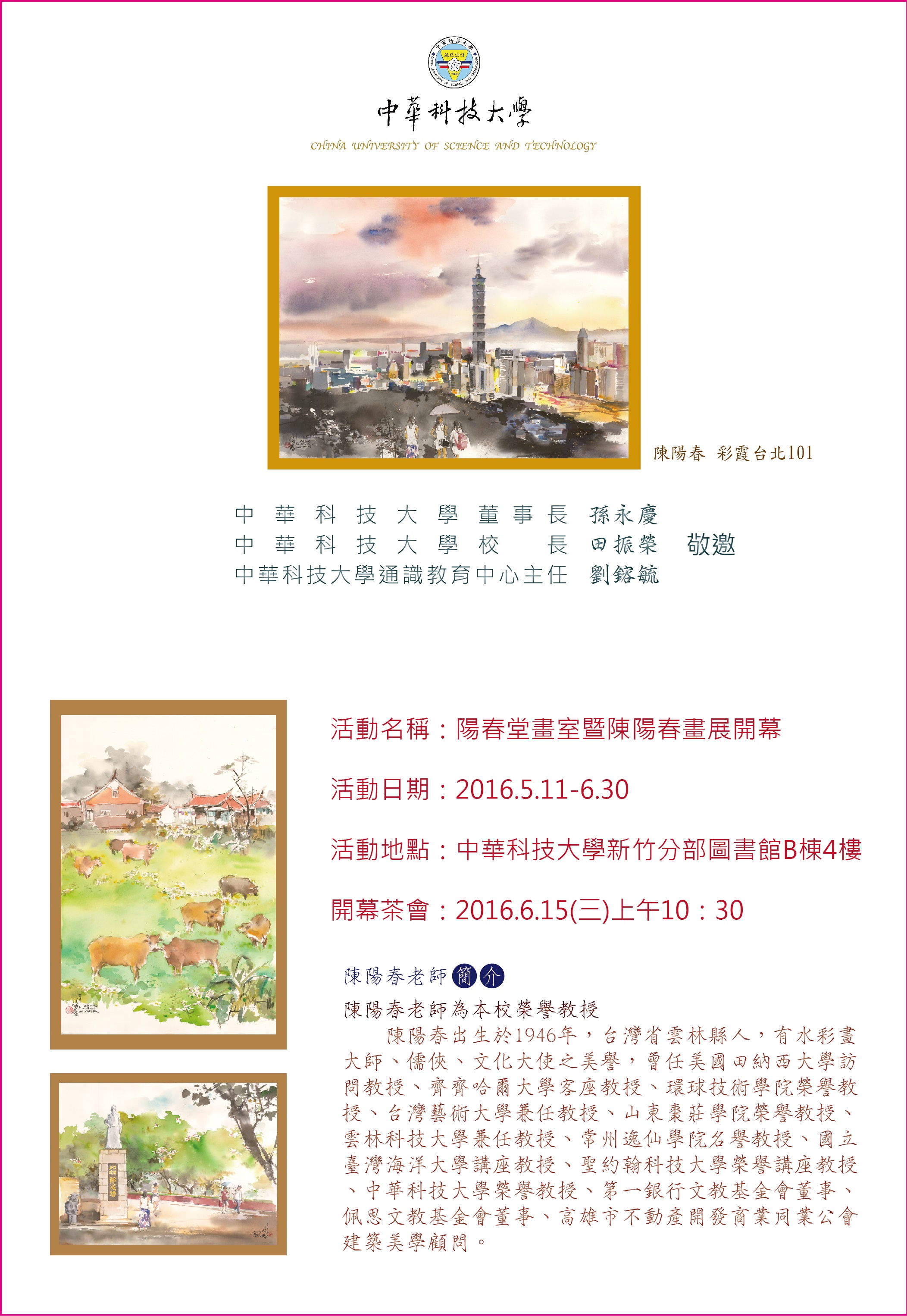 簡 介 中華科技大學105學年駐校藝術家 臺北市陽春水彩藝術會現任會長 曾任營造公司總經理 曾任陳金水建築師事務所顧問(已退休) 專精書法真草隸篆